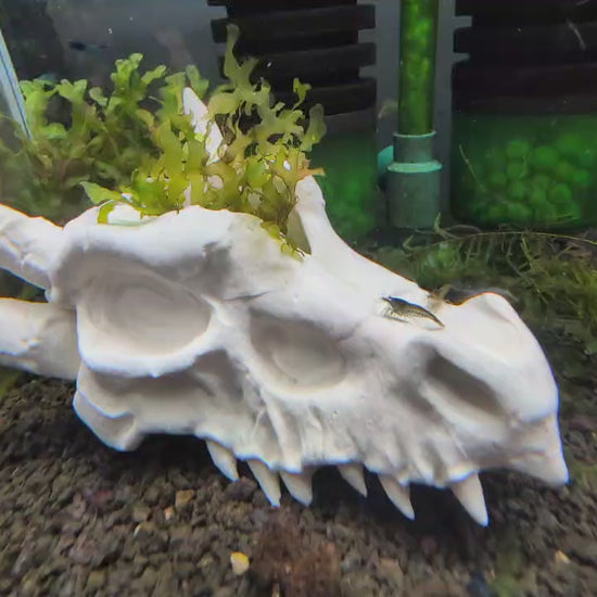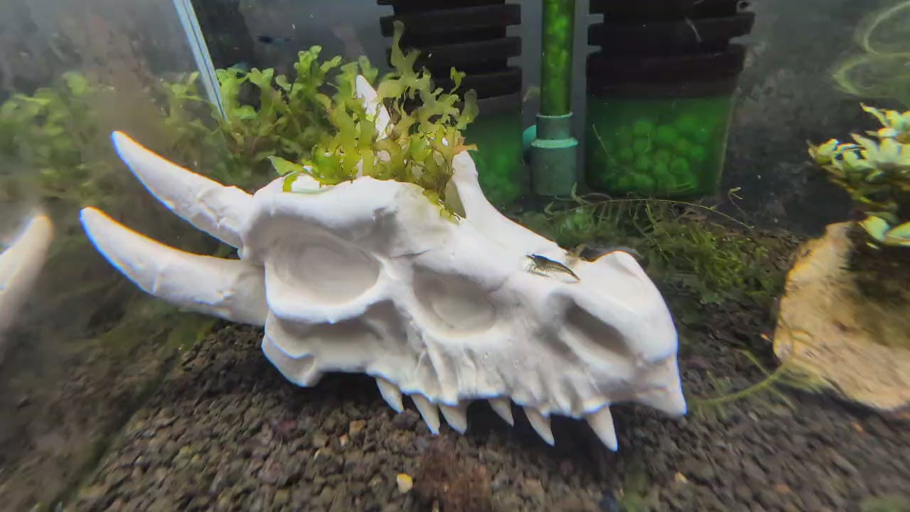 Add a realistic fantasy centerpiece to your aquarium while giving your tank residents a secure place to retreat. This Dragon Skull Aquarium Decor is 3D printed in a bone white filament for a natural, realistic skull look, with a hollowed-out interior that functions as a hide/cave for fish and shrimp.